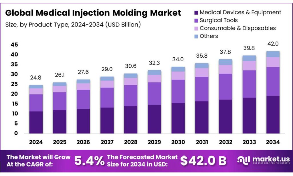 - The global medical injection molding market is projected to grow at a CAGR of 5.4% and is estimated to reach USD 42.0 billion by 2034.