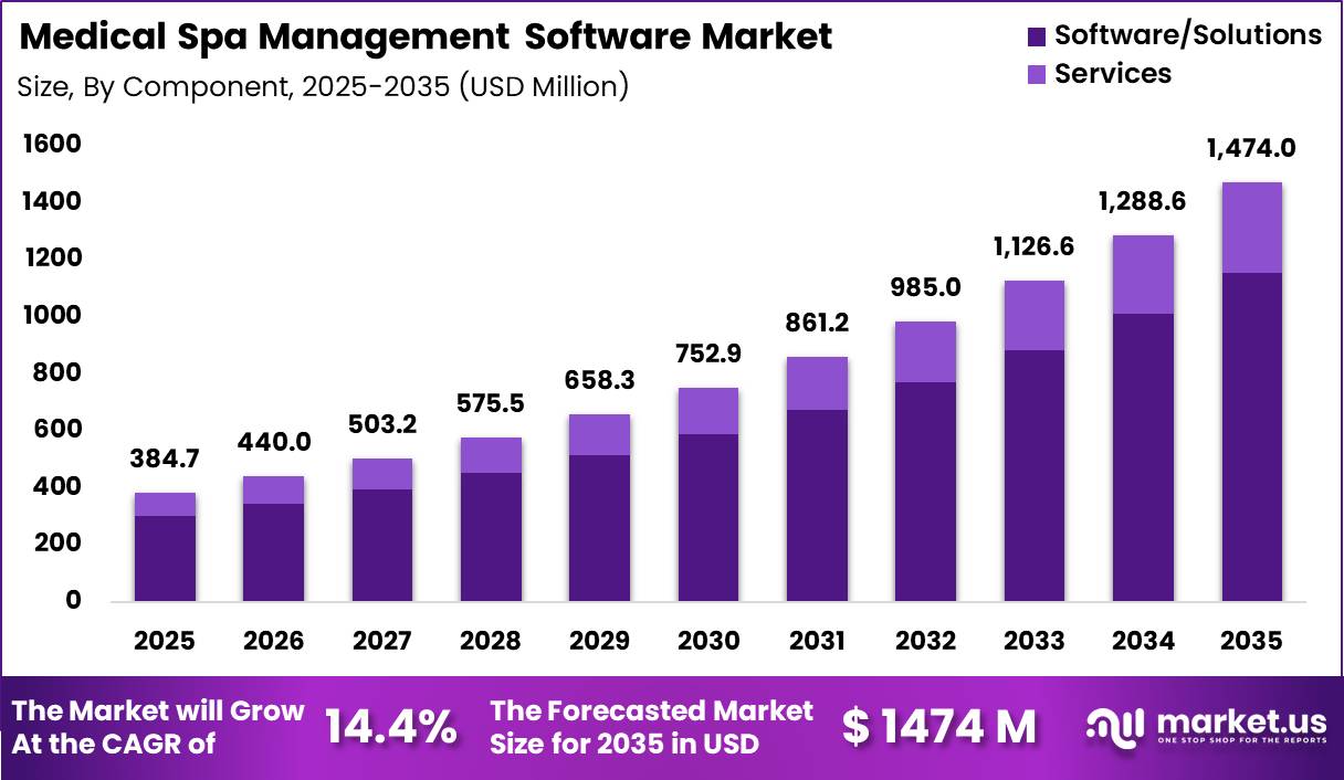 - Market Size: Global Medical Spa Management Software Market size is expected to be worth around US$ 1474.0 Million by 2035 from US$ 384.7 Million in 2025.