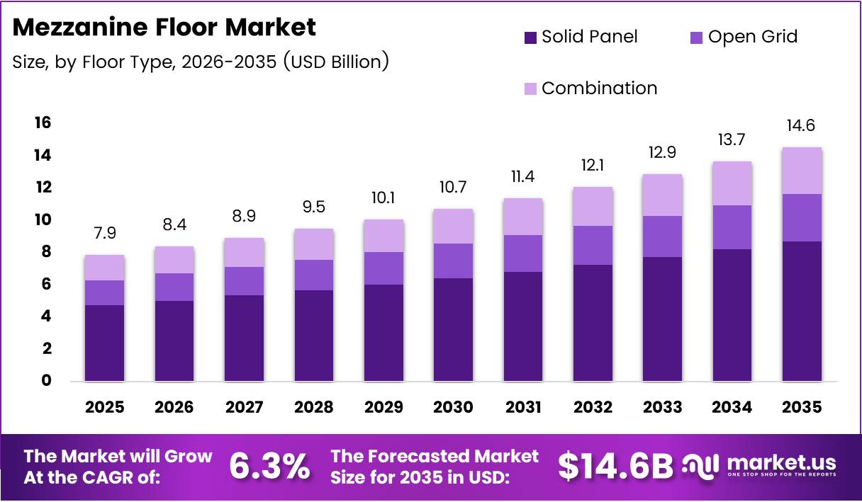 Global Mezzanine Floor Market size is expected to be worth around USD 14.6 Billion by 2035 from USD 7.9 Billion in 2025, growing at a CAGR of 6.3% during the forecast period 2026 to 2035.