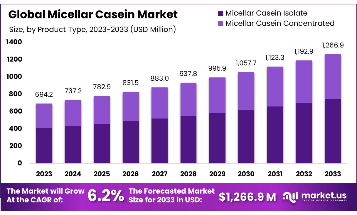 - Micellar Casein Market size is expected to be worth around USD 1266.9 Mn by 2033, from USD 694.2 Mn in 2023, growing at a CAGR of 6.2%.
