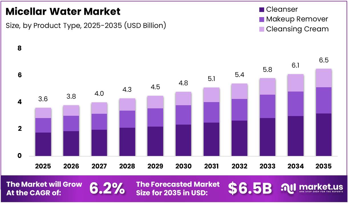 The Global Micellar Water Market size is expected to be worth around USD 6.5 Billion by 2035 from USD 3.6 Billion in 2025, growing at a CAGR of 6.2% during the forecast period 2026 to 2035.