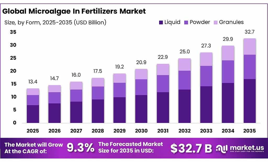 - Microalgae In Fertilizers Market size is expected to be worth around USD 32.7 Billion by 2035, from USD 13.4 Billion in 2025, growing at a CAGR of 9.3%.