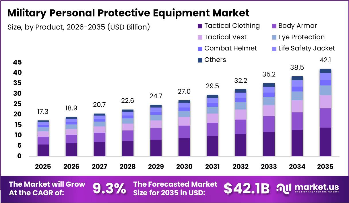 Report Features Description Market Value (2025) USD 17.3 Billion Forecast Revenue (2035) USD 42.1 Billion CAGR (2026-2035) 9.3% Base Year for Estimation 2025 Historic Period 2020-2024 Forecast Period 2026-2035 Report Coverage Revenue Forecast, Market Dynamics, Competitive Landscape, Recent Developments Segments Covered By Product (Tactical Clothing, Body Armor, Tactical Vest, Eye Protection, Combat Helmet, Life Safety Jacket, Backpack, Pelvic Protection, Respiratory Protection, Others), By End Use (Army, Navy, Air Force), By Distribution Channel (Government & Defense Tenders, Direct Institutional Procurement, Authorized Distributors, Defense Contractors) Regional Analysis North America (US and Canada), Europe (Germany, France, The UK, Spain, Italy, and Rest of Europe), Asia Pacific (China, Japan, South Korea, India, Australia, and Rest of APAC), Latin America (Brazil, Mexico, and Rest of Latin America), Middle East & Africa (GCC, South Africa, and Rest of MEA) Competitive Landscape 3M, NFM Group, SnigelDesign AB, Varusteleka, SAVOTTA, PGD, Avon Protection, Drägerwerk AG & Co. KGaA, uvex group, GENTEX CORPORATION Customization Scope Customization for segments, region/country-level will be provided. Moreover, additional customization can be done based on the requirements. Purchase Options We have three licenses to opt for: Single User License, Multi-User License (Up to 5 Users), Corporate Use License (Unlimited User and Printable PDF)