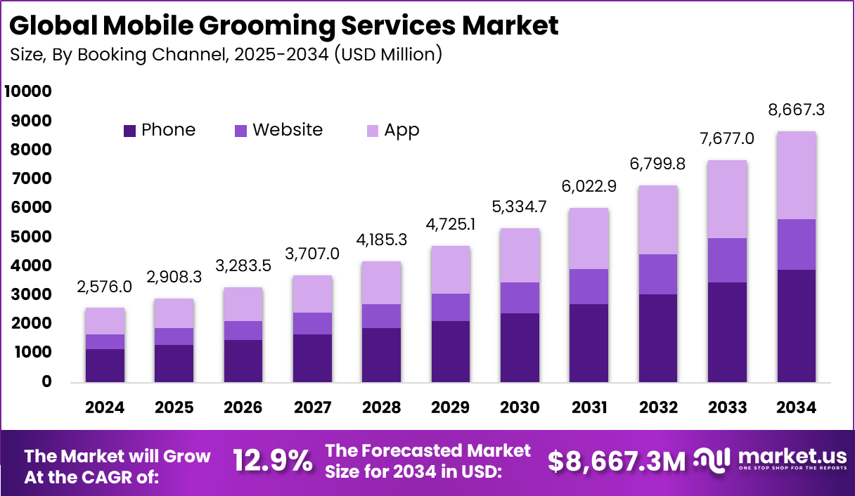 Global Mobile Grooming Services Market Size, Share, Industry Analysis Report By Pet Type (Dogs, Cats, Other small pets [rabbits, guinea pigs]), By Service Type (Full groom / haircut, Bath & brush, De-shedding / undercoat, Add-ons [nails, ears, teeth], Medicated / flea–tick care), By Service Mode (Van-based mobile spa, In-home [no van]), By Provider Type (Independent owner-operators, Regional chains / franchises, National franchises), By Booking Channel (Phone, Website, App), By Region and Companies - Industry Segment Outlook, Market Assessment, Competition Scenario, Trends and Forecast 2025-2034