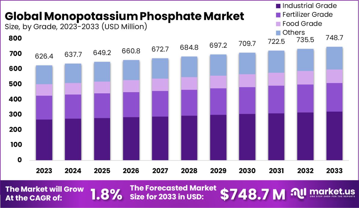 - The Global Monopotassium phosphate Market is expected to be worth around USD 748.7 Million by 2033, up from USD 626.4 Million in 2023, and grow at a CAGR of 1.8% from 2024 to 2033.