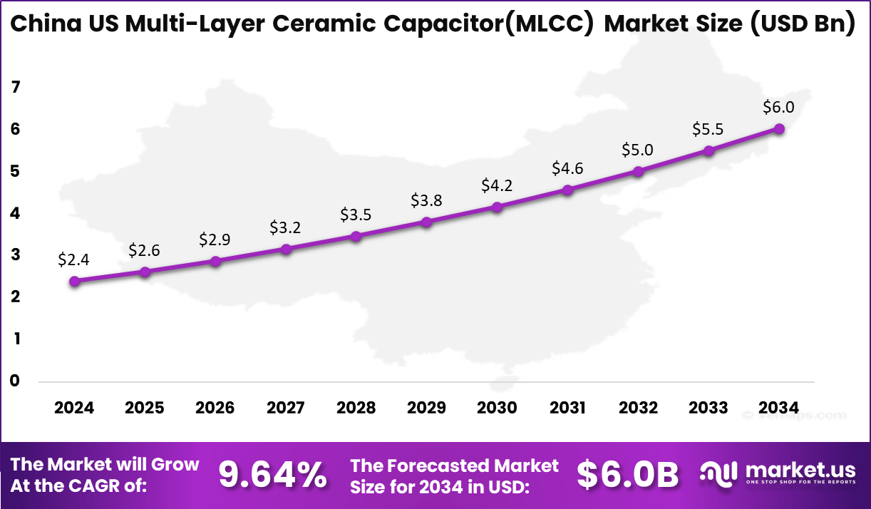 - Market Growth: The global MLCC market is projected to grow from USD 14.8 billion in 2024 to USD 36.0 billion by 2034, registering a CAGR of 9.30%.
