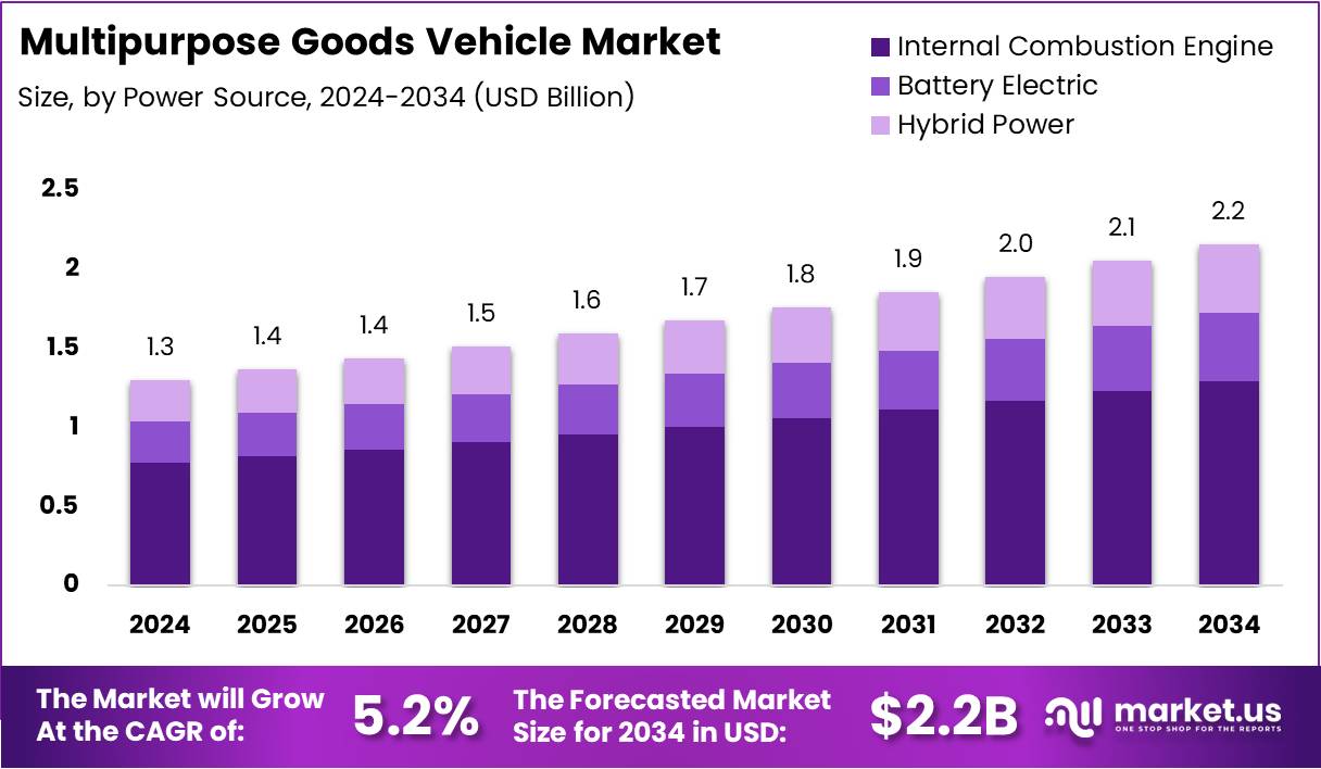 The Global Multipurpose Goods Vehicle Market size is expected to be worth around USD 2.2 Billion by 2034, from USD 1.3 Billion in 2024, growing at a CAGR of 5.2% during the forecast period from 2025 to 2034.