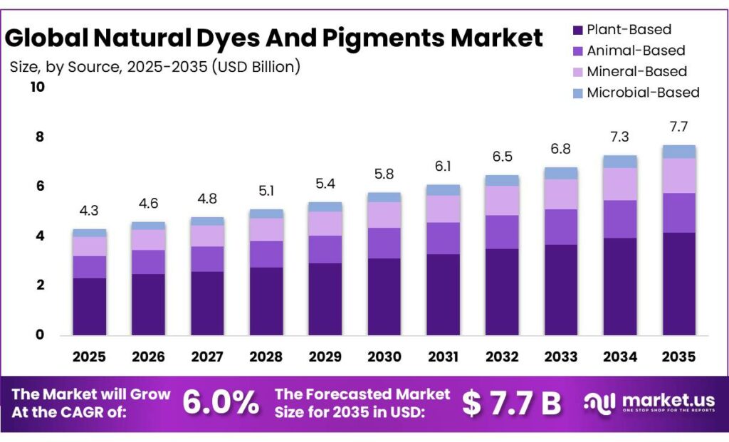 - Natural Dyes And Pigments Market size is expected to be worth around USD 7.7 Billion by 2035, from USD 4.3 Billion in 2025, growing at a CAGR of 6.0%.