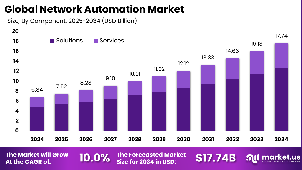 - In 2024, solutions dominated the network automation market with a 71.5% share, reflecting strong demand for end-to-end automation platforms that simplify network configuration, monitoring, and operations.