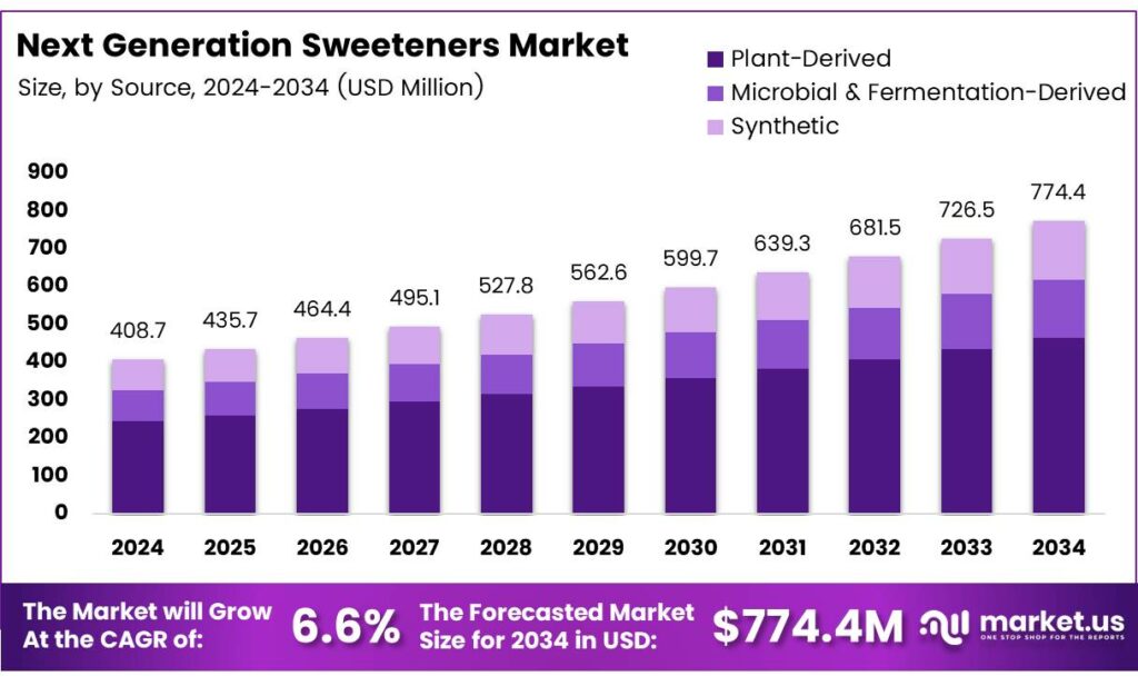 - The Global Next Generation Sweeteners Market is projected to grow from USD 408.7 million in 2024 to USD 774.4 million by 2034, registering a 6.6% CAGR during 2025–2034.