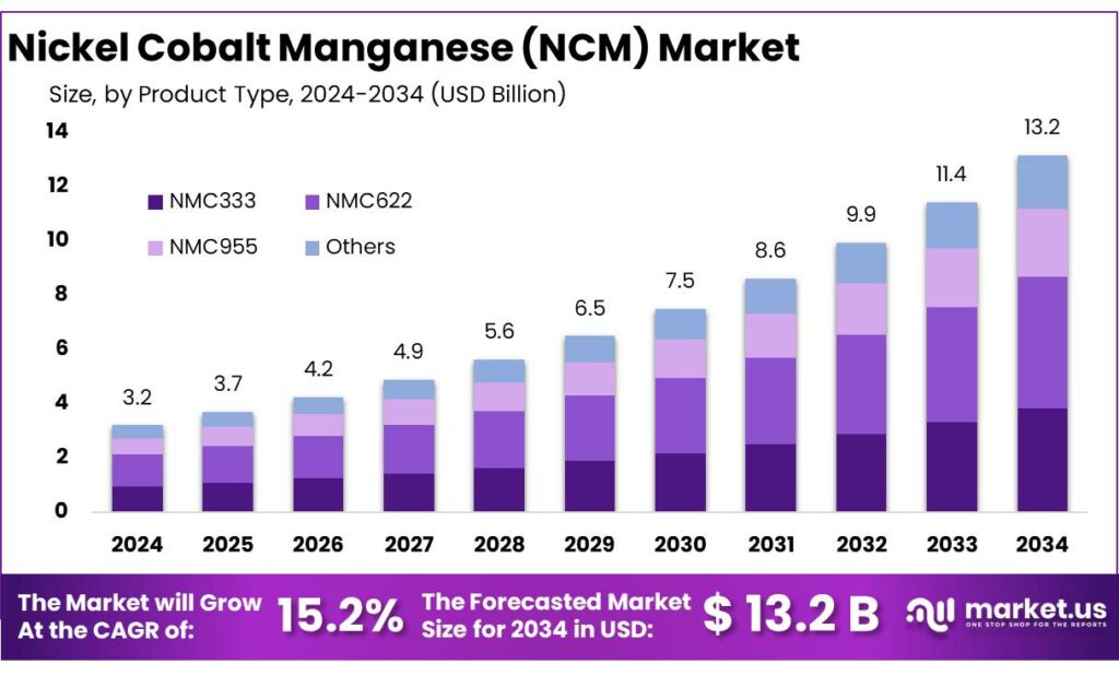 - Nickel Cobalt Manganese (NCM) Market is expected to be worth around USD 13.2 Billion by 2034, up from USD 3.2 Billion in 2024, and is projected to grow at a CAGR of 15.2%.
