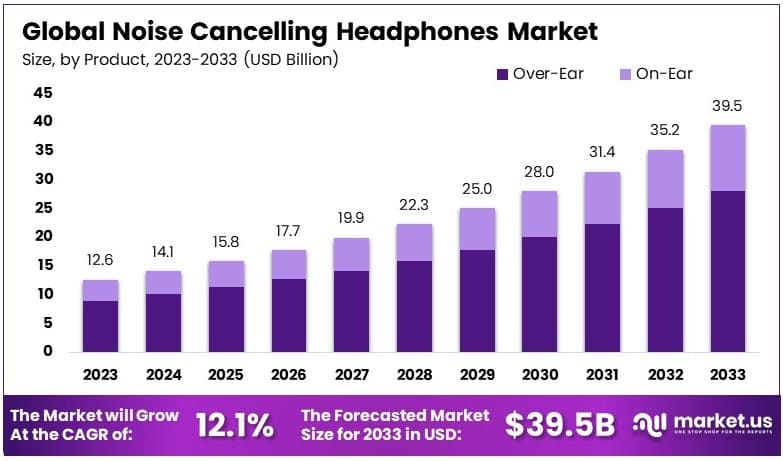 - The Noise Cancelling Headphones Market was valued at USD 12.6 billion in 2023 and is forecasted to reach USD 39.5 billion by 2033, with a CAGR of 12.1%.