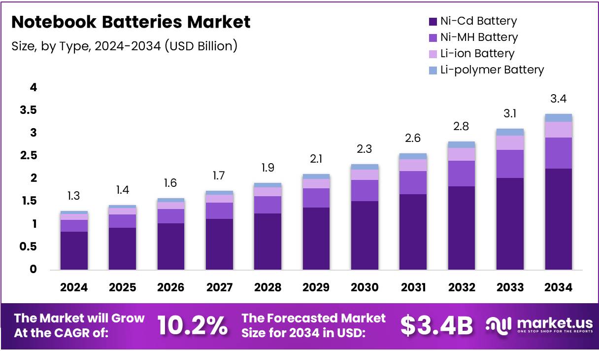 - The global notebook batteries market is projected to grow from USD 1.3 Billion in 2024 to USD 3.4 Billion by 2034, registering a CAGR of 10.2%.