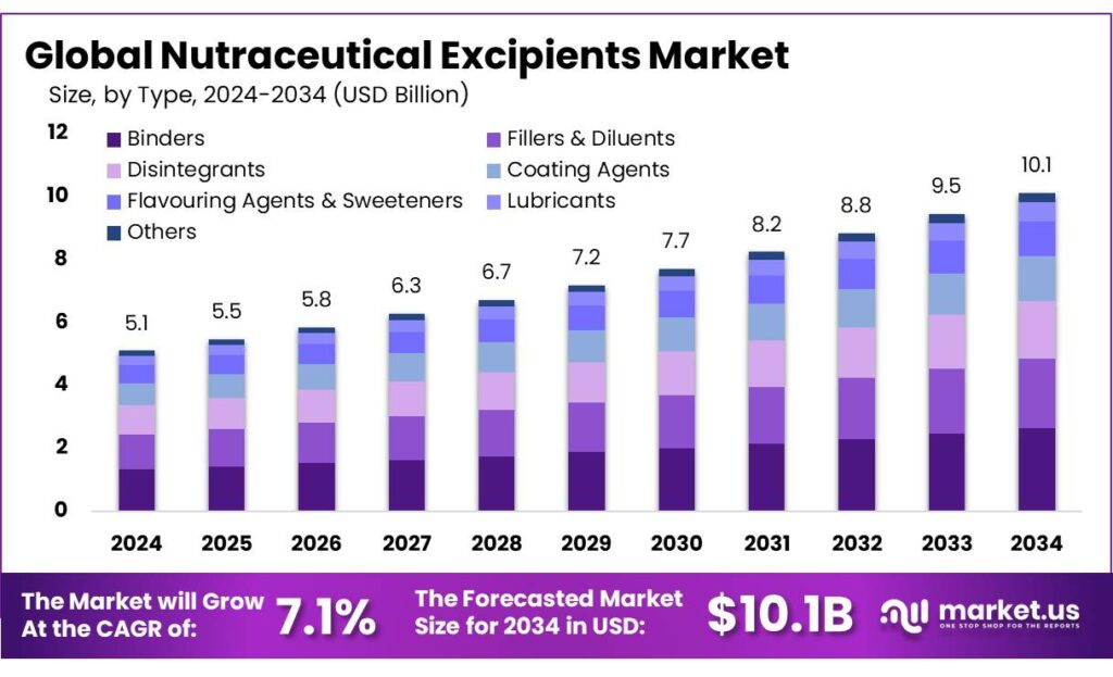- Nutraceutical Excipients Market size is expected to be worth around USD 10.1 Billion by 2034, from USD 5.1 Billion in 2024, growing at a CAGR of 7.1%.