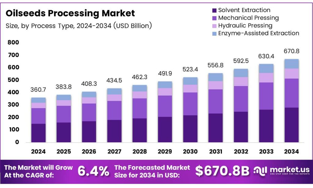 - The Global Oilseeds Processing Market is projected to grow from USD 360.7 billion in 2024 to USD 670.8 billion by 2034, registering a 6.4% CAGR during 2025–2034.