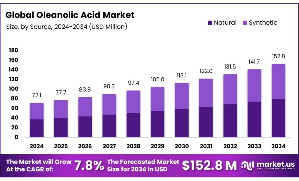 - The global oleanolic acid market is projected to grow at a CAGR of 7.8% and is estimated to reach USD 152.8 million by 2034.