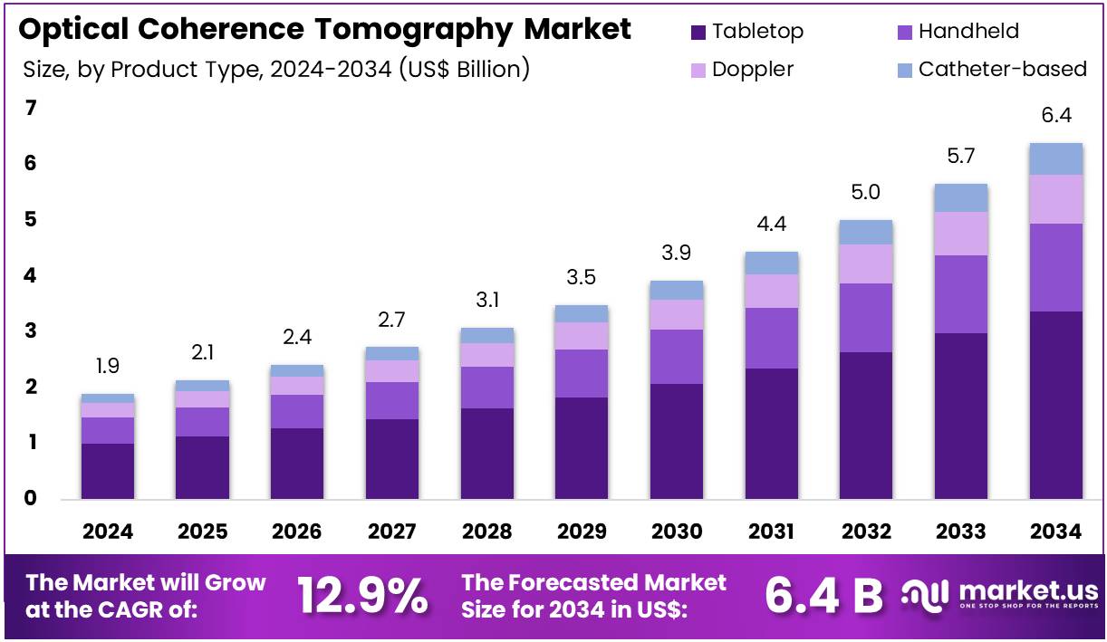 Optical Coherence Tomography Market By Product Type (Tabletop, Handheld, Doppler, and Catheter Based), By Technology (Spectral Domain OCT, Time Domain OCT, and Swept-Source OCT), By Application (Ophthalmology, Oncology, Dermatology, Cardiology, and Others), By End-user (Hospitals, Ambulatory Surgical Centers, Diagnostic Imaging Centers, and Others), Region and Companies – Industry Segment Outlook, Market Assessment, Competition Scenario, Trends and Forecast 2025-2034