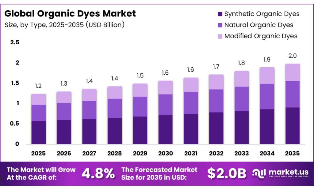 The Global Organic Dyes Market size is expected to be worth around USD 2.0 billion by 2035 from USD 1.2 billion in 2025, growing at a CAGR of 4.8% during the forecast period 2026 to 2035.