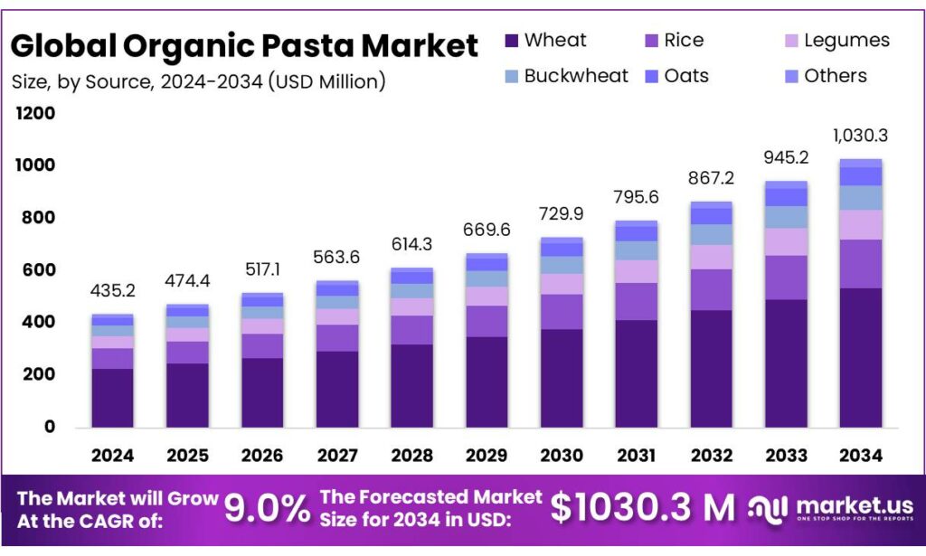 - Organic Pasta Market size is expected to be worth around USD 1030.3 Million by 2034, from USD 435.2 Million in 2024, growing at a CAGR of 9.0%.