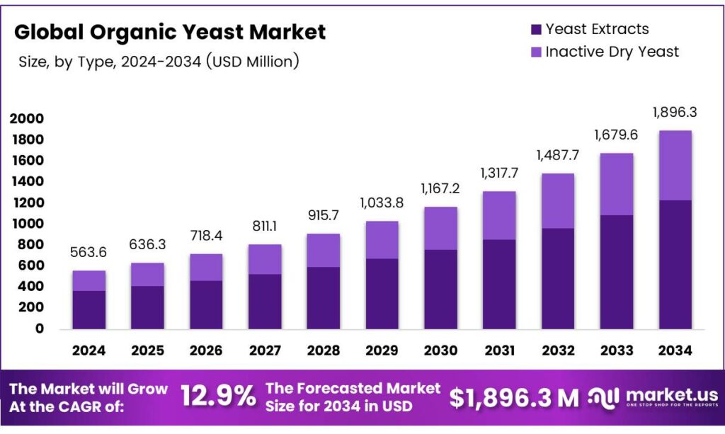 - The Global Organic Yeast Market is projected to grow from USD 563.6 million in 2024 to USD 1896.3 million by 2034 at a 12.9% CAGR.