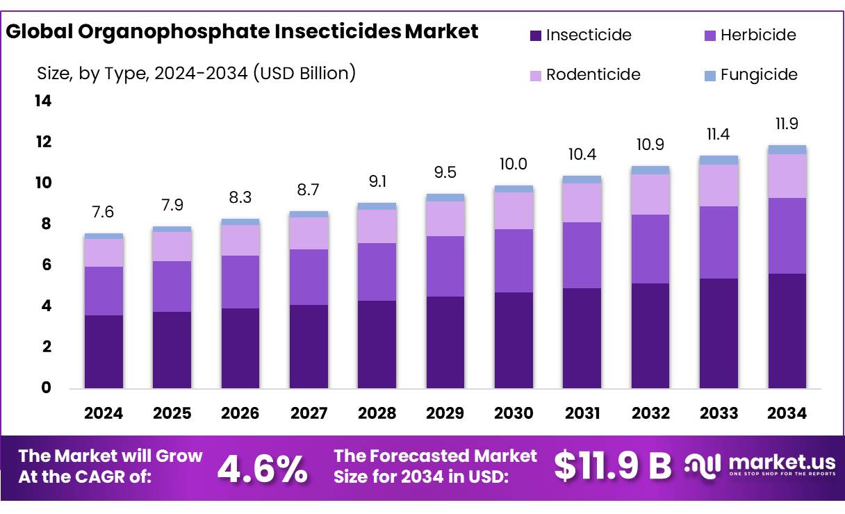 - Organophosphate Insecticides Market size is expected to be worth around USD 11.9 Billion by 2034, from USD 7.6 Billion in 2024, growing at a CAGR of 4.6%.