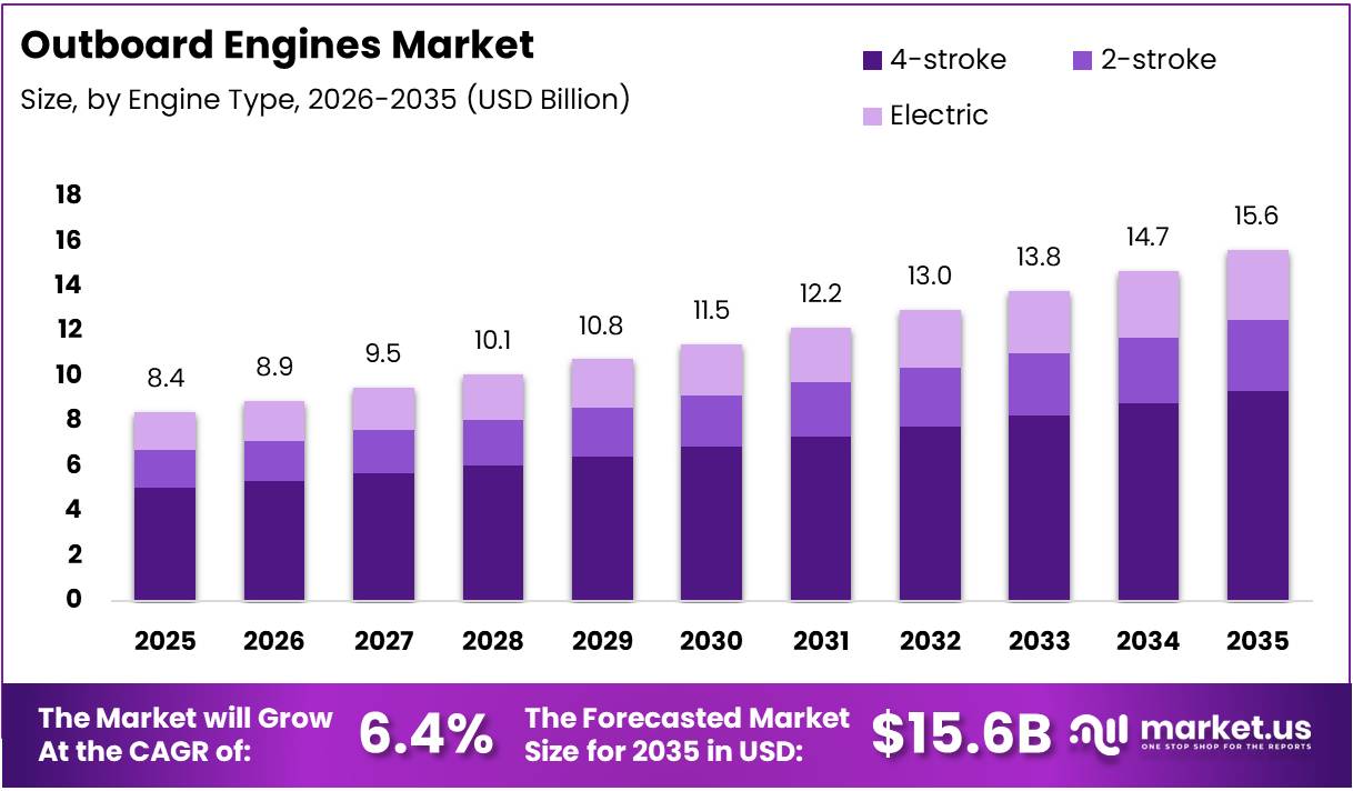The Global Outboard Engines Market size is expected to be worth around USD 15.6 Billion by 2035, from USD 8.4 Billion in 2025, growing at a CAGR of 6.4% during the forecast period from 2026 to 2035.