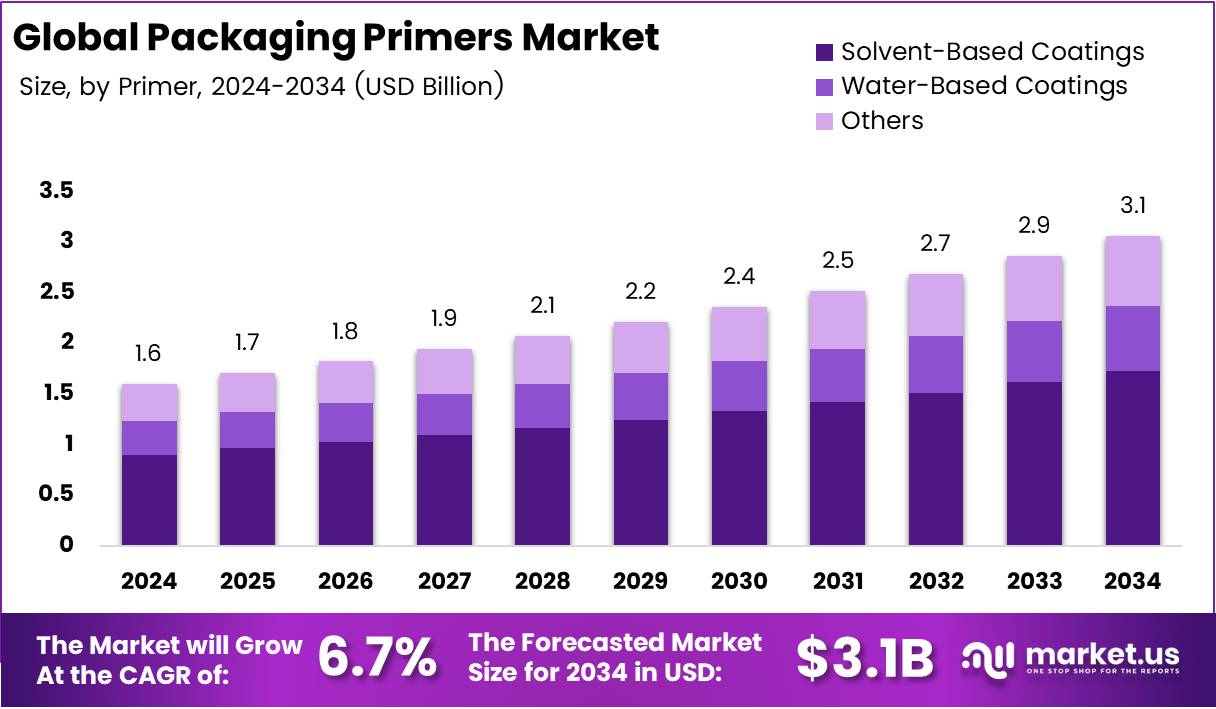 The Global Packaging Primers Market size is expected to be worth around USD 3.1 Billion by 2034, from USD 1.6 Billion in 2024, growing at a CAGR of 6.7% during the forecast period from 2025 to 2034.