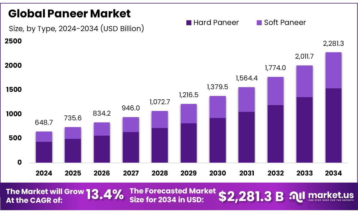 The Global Paneer Market size is expected to be worth around USD 2281.3 Bn by 2034, from USD 648.7 Bn in 2024, growing at a CAGR of 13.4% during the forecast period from 2025 to 2034.
