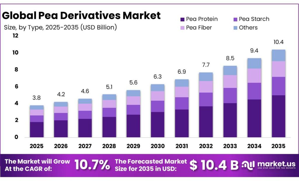 - Pea Derivatives Market size is expected to be worth around USD 10.4 Billion by 2035, from USD 3.8 Billion in 2025, growing at a CAGR of 10.7%.
