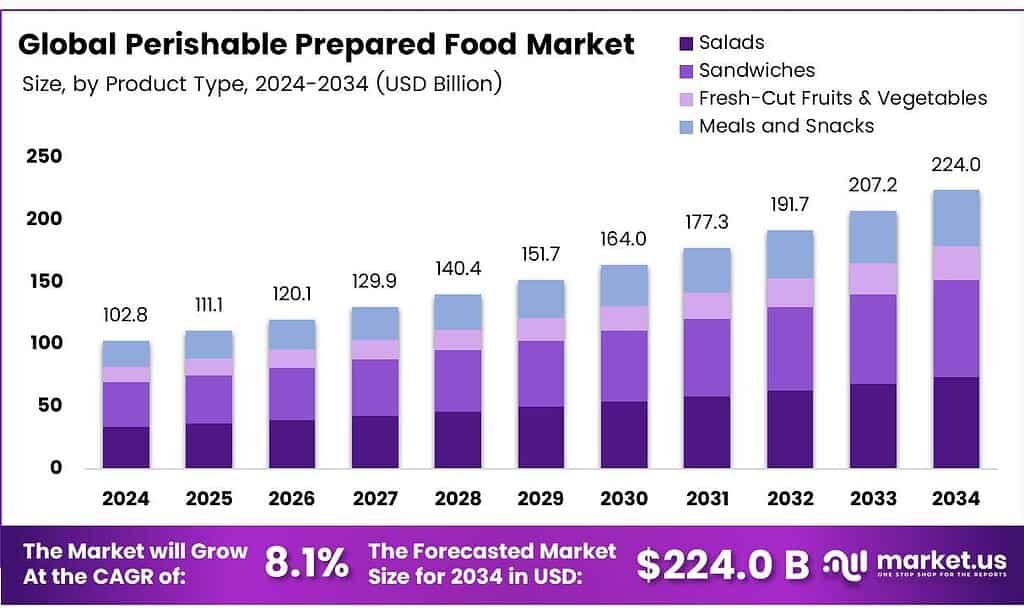 - The Global Perishable Prepared Food Market is expected to grow from USD 102.8 billion in 2024 to USD 224.0 billion by 2034 at 8.1% CAGR.