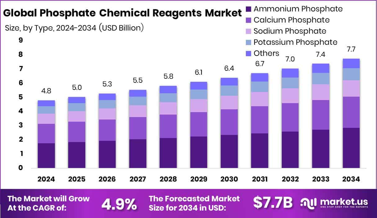 - The Global Phosphate Chemical Reagents Market is expected to be worth around USD 7.7 billion by 2034, up from USD 4.8 billion in 2024, and is projected to grow at a CAGR of 4.9% from 2025 to 2034.