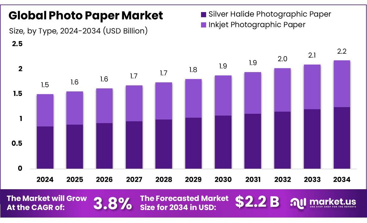 - Photo Paper Market size is expected to be worth around USD 2.2 Bn by 2034, from USD 1.5 Bn in 2024, growing at a CAGR of 3.8%.