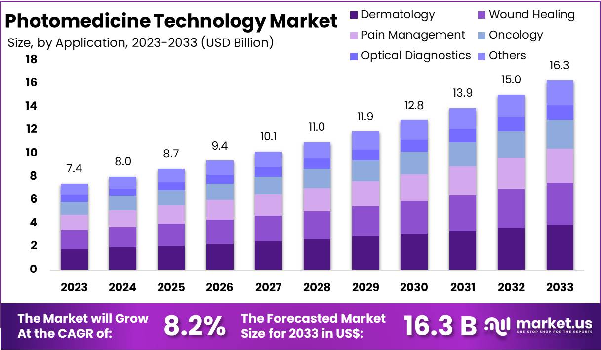 - The Photomedicine Technology Market is projected to reach approximately USD 16.3 billion by 2033, growing from USD 7.4 billion in 2023 with an 8.2% CAGR.