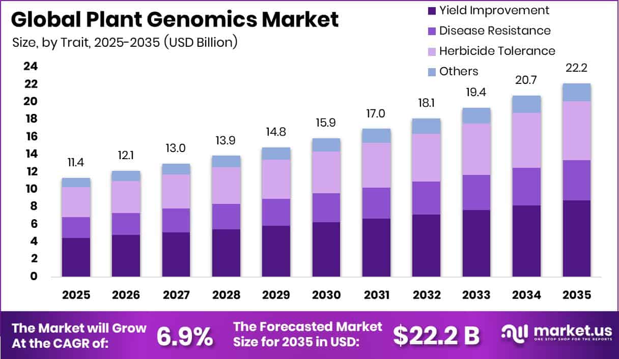 Yield improvement dominated the Plant Genomics Market by trait with 39.5% share.
