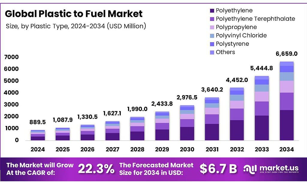 - According to the International Energy Agency’s (IEA) World Energy Outlook 2025 report, global energy demand grew by 2.2% in 2024, faster than the average rate over the past decade, creating demand for innovations in the fuel industry, such as plastic-to-fuel.
