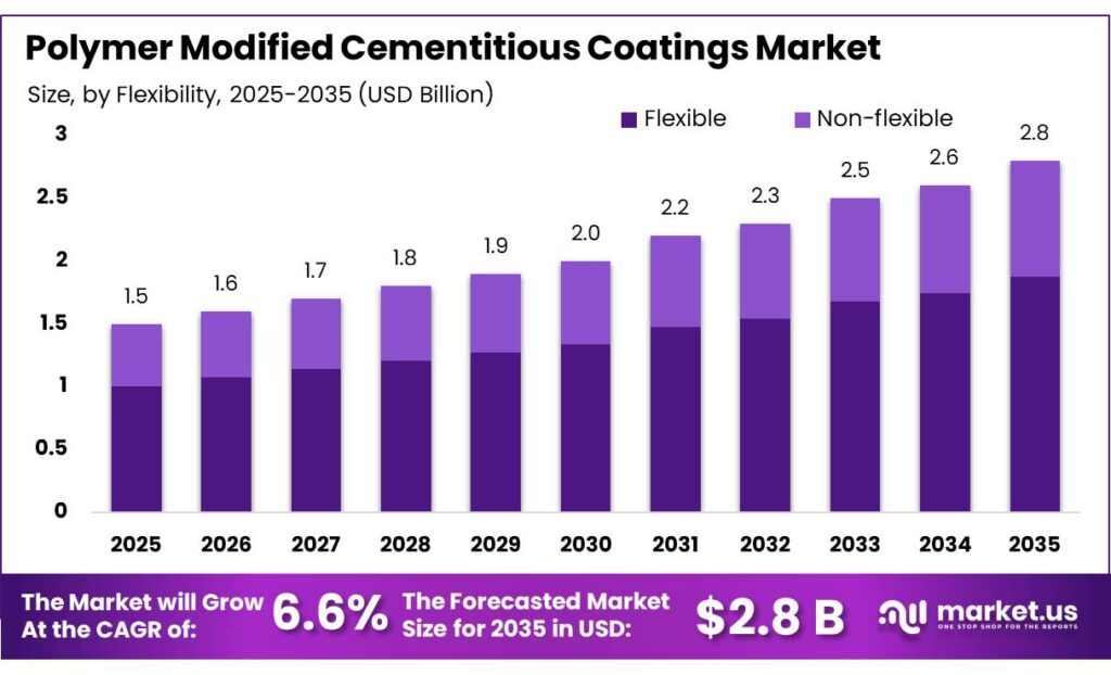 - Polymer Modified Cementitious Coatings Market size is expected to be worth around USD 2.8 Billion by 2035, from USD 1.5 Billion in 2025, growing at a CAGR of 6.6%.