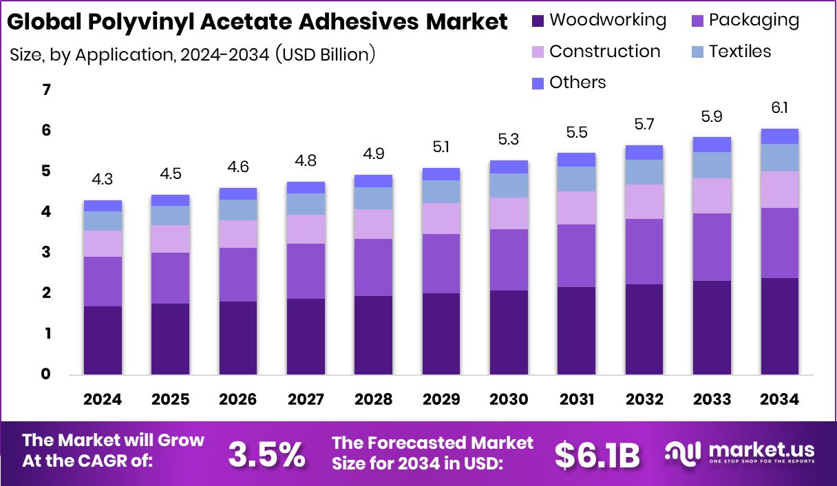- The Global Polyvinyl Acetate Adhesives Market is expected to be worth around USD 6.1 billion by 2034, up from USD 4.3 billion in 2024, and is projected to grow at a CAGR of 3.5% from 2025 to 2034.