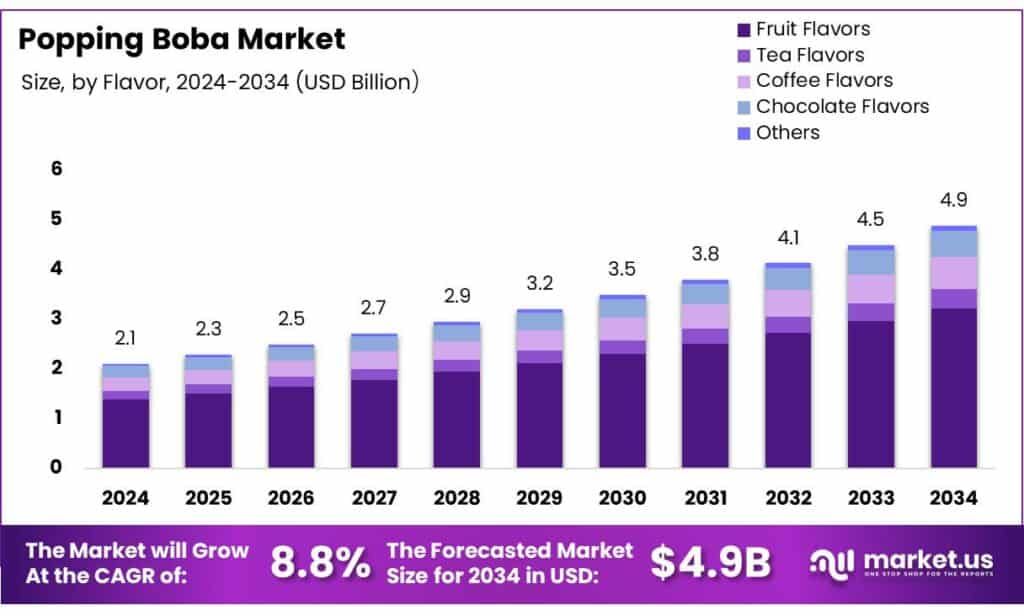 - Popping Boba Market size is expected to be worth around USD 4.9 Billion by 2034, from USD 2.1 Billion in 2024, growing at a CAGR of 8.8%.