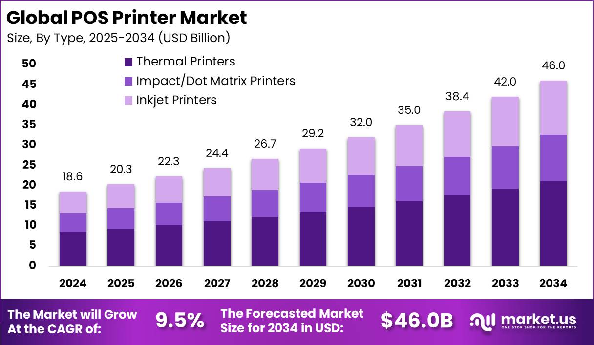 Report Features Description Market Value (2024) USD 18.6 Bn Forecast Revenue (2034) USD 46 Bn CAGR(2025-2034) 9.5% Base Year for Estimation 2024 Historic Period 2020-2023 Forecast Period 2025-2034 Report Coverage Revenue forecast, AI impact on Market trends, Share Insights, Company ranking, competitive landscape, Recent Developments, Market Dynamics and Emerging Trends Segments Covered By Type (Thermal Printers, Impact/Dot Matrix Printers, Inkjet Printers), By Design (Desktop POS Printers, Mobile POS Printers, Kiosk POS Printers), By Connectivity (Wired, Wireless), By Output Type (Receipt Printers, Label Printers, Ticket Printers, Multi-functional Printers, Others), By End Use (Restaurant, Hospitality, Healthcare, Retail, Warehouse, Entertainment, Others) Regional Analysis North America – US, Canada; Europe – Germany, France, The UK, Spain, Italy, Russia, Netherlands, Rest of Europe; Asia Pacific – China, Japan, South Korea, India, New Zealand, Singapore, Thailand, Vietnam, Rest of Latin America; Latin America – Brazil, Mexico, Rest of Latin America; Middle East & Africa – South Africa, Saudi Arabia, UAE, Rest of MEA Competitive Landscape Bixolon, Citizen Systems, Epson Corporation, Honeywell International Inc., HP Development Company, Mitsubishi Electric Corporation, NGX Technologies, Posiflex Technology, Inc., Seiko Instruments Inc., Sewoo Tech, Shenzhen Xprinter Technology Co., Ltd., Star Micronics Co., Ltd., Toshiba Tec Corporation, TSC Auto ID Technology Co., Ltd., Zebra Technologies Corporation, Other Major Players Customization Scope Customization for segments, region/country-level will be provided. Moreover, additional customization can be done based on the requirements. Purchase Options We have three license to opt for: Single User License, Multi-User License (Up to 5 Users), Corporate Use License (Unlimited User and Printable PDF)