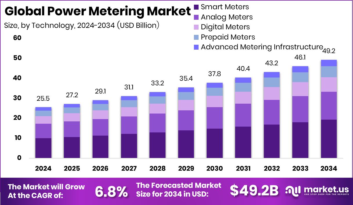 - The Global Power Metering Market is expected to be worth around USD 49.2 billion by 2034, up from USD 25.5 billion in 2024, and is projected to grow at a CAGR of 6.8% from 2025 to 2034.