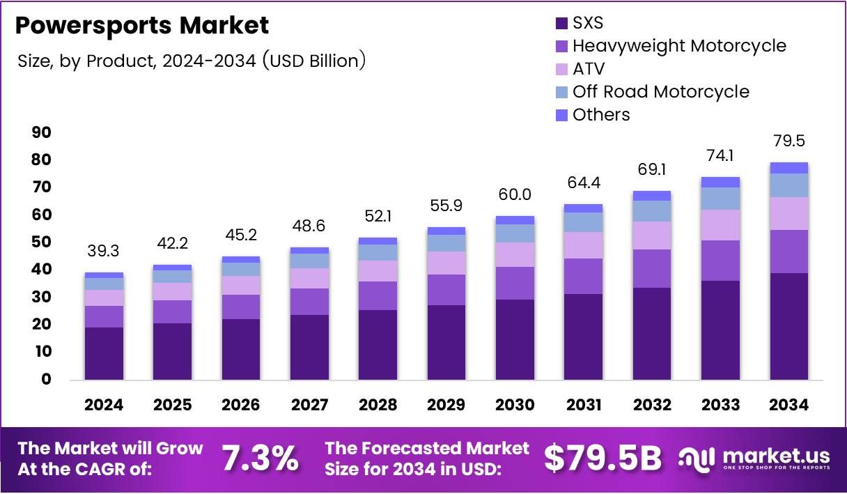 - Global Powersports Market size projected to reach USD 79.5 Billion by 2034 from USD 39.3 Billion in 2024, at a CAGR of 7.3%.