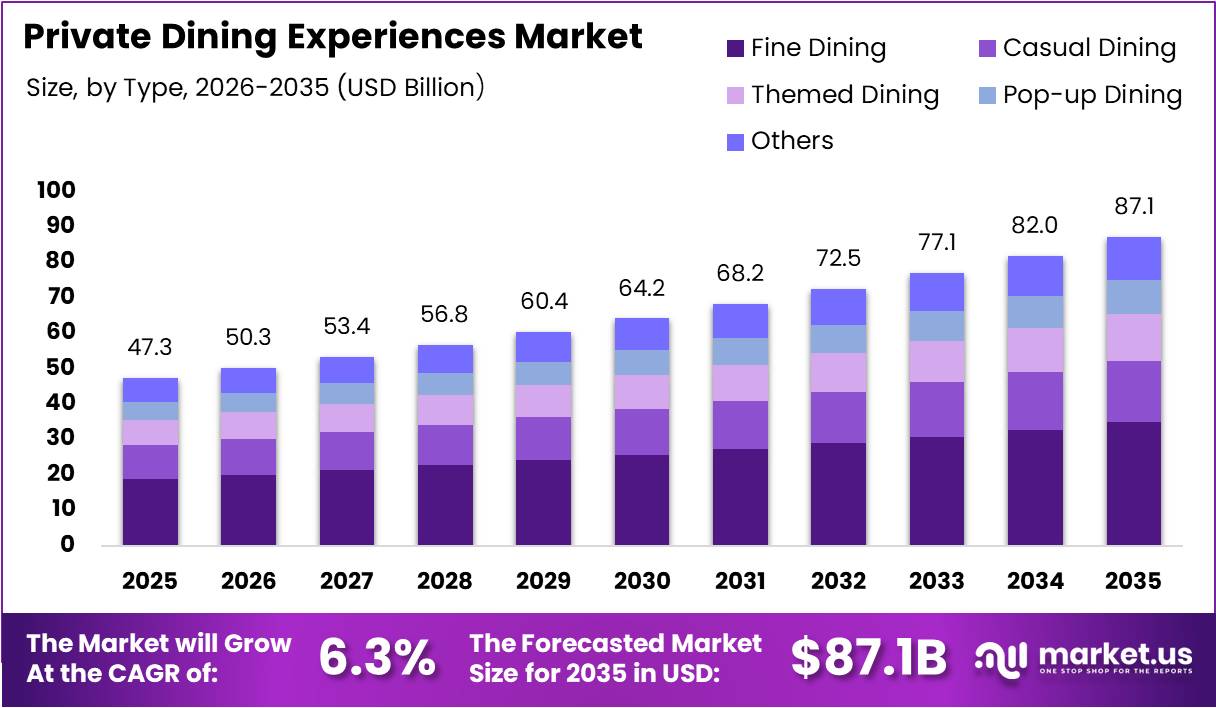 The Global Private Dining Experiences Market size is expected to be worth around USD 87.1 Billion by 2035, from USD 47.3 Billion in 2025, growing at a CAGR of 6.3% during the forecast period from 2026 to 2035.