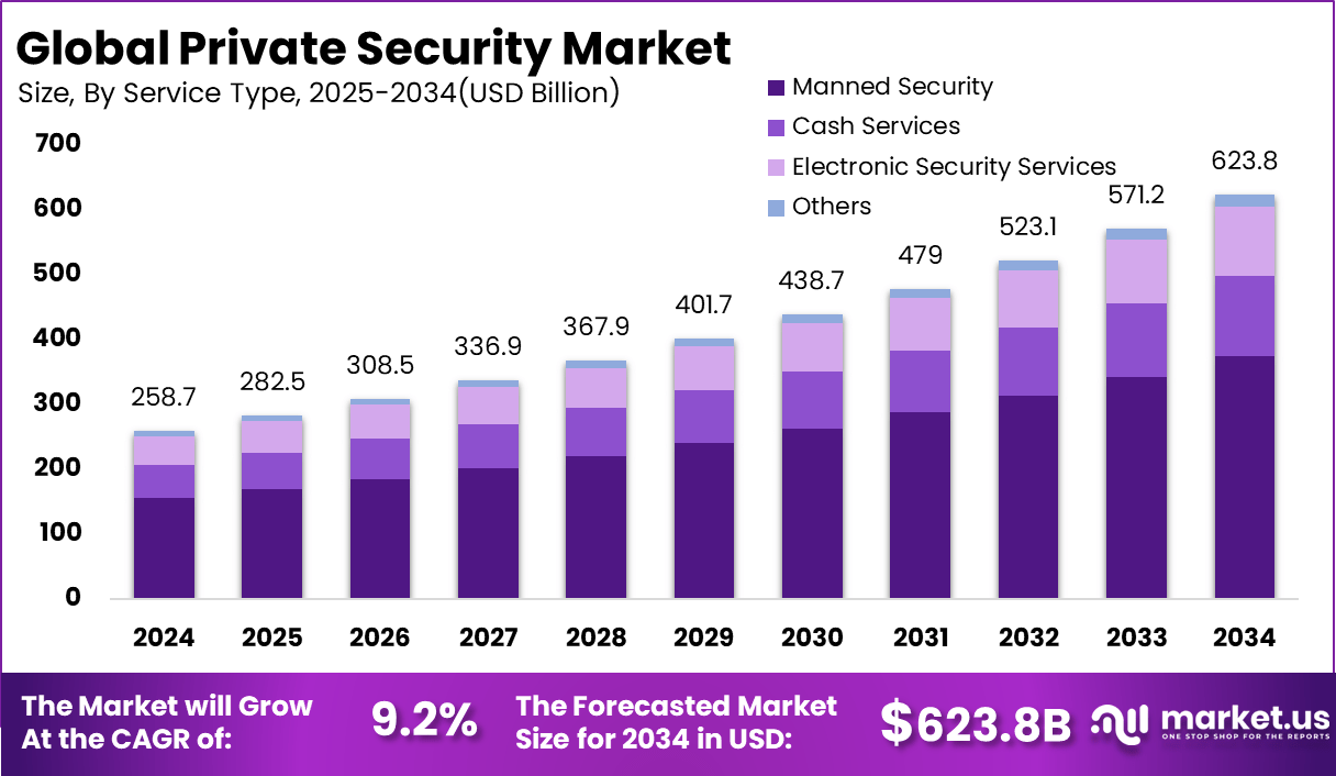 The private security market has witnessed substantial growth over recent years. Several factors are propelling the growth of the private security market. Rising crime rates and the threat of terrorism have heightened the demand for professional security services. Additionally, the proliferation of cyber threats has necessitated advanced cybersecurity measures. The expansion of critical infrastructure, such as energy and transportation sectors, also requires enhanced security protocols .