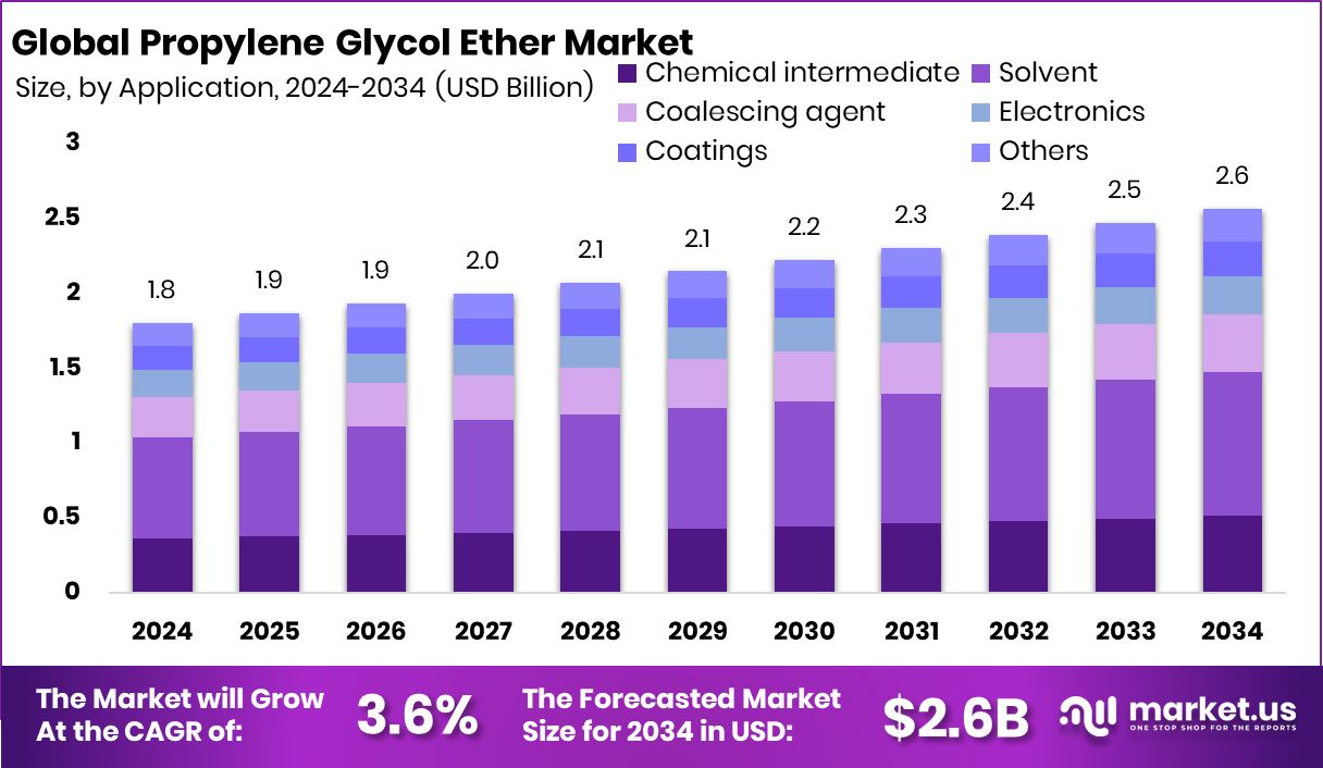 - The Global Propylene Glycol Ether Market is expected to be worth around USD 2.6 billion by 2034, up from USD 1.8 billion in 2024, and is projected to grow at a CAGR of 3.6% from 2025 to 2034.