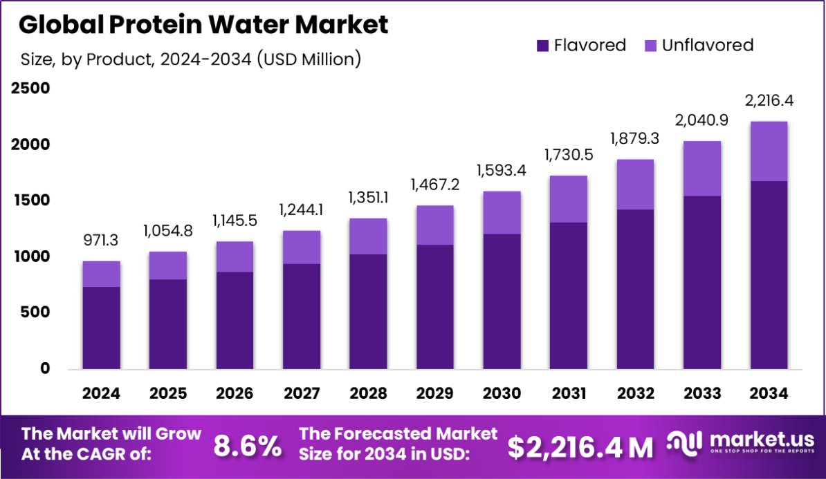 - Global Protein Water Market is expected to be worth around USD 2,216.4 Million by 2034, up from USD 971.3 Million in 2024, and grow at a CAGR of 8.6% from 2025 to 2034.