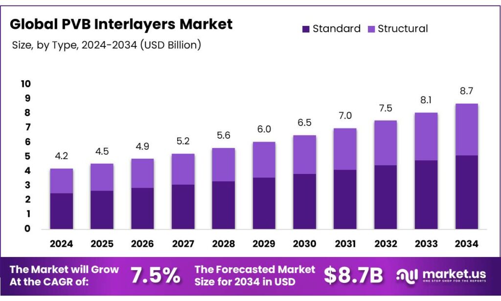 - The global PVB interlayers market is projected to grow at a CAGR of 7.5% and is estimated to reach USD 8.7 billion by 2034.