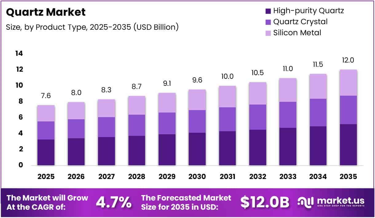 The Global Quartz Market size is expected to be worth around USD 12.0 Billion by 2035 from USD 7.6 Billion in 2025, growing at a CAGR of 4.7% during the forecast period 2026 to 2035.
