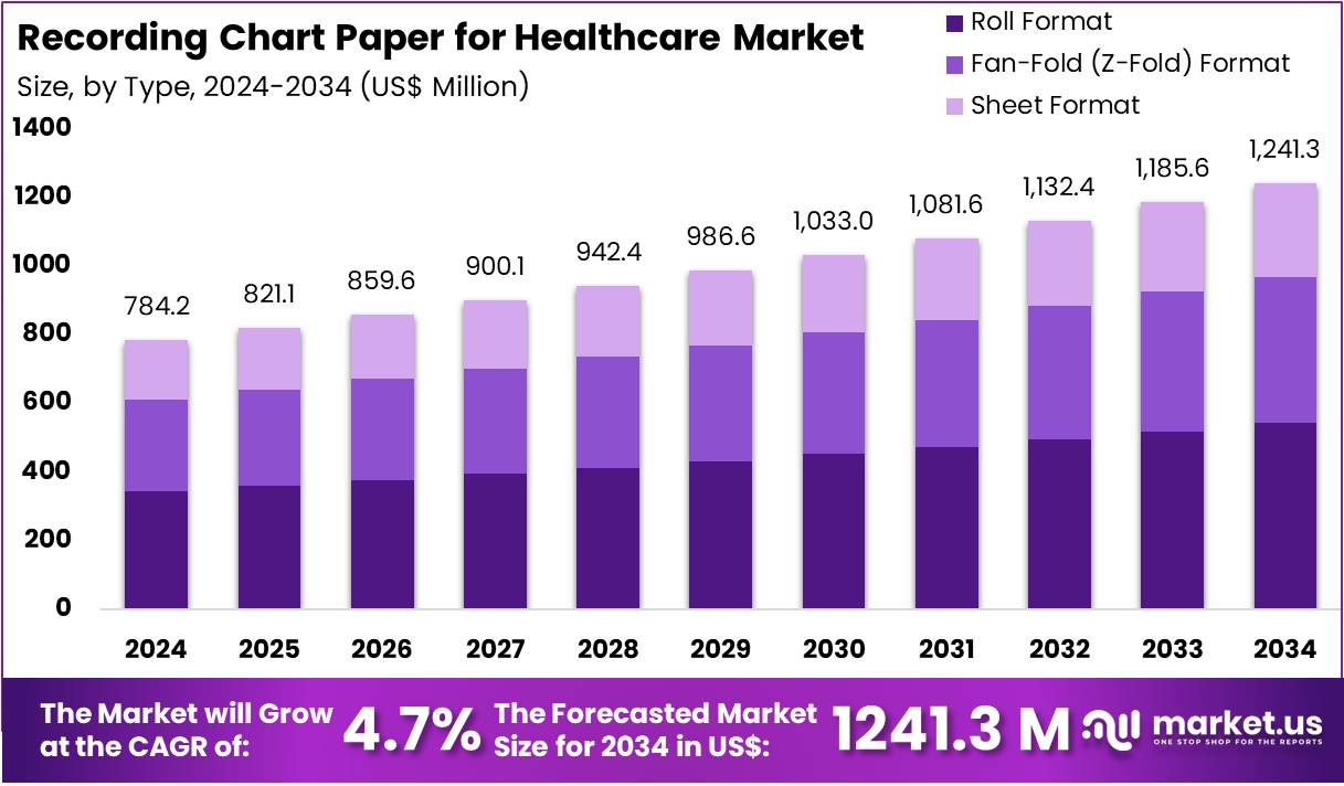 - The global recording chart paper market in healthcare is projected to reach US$ 1241.3 million by 2034, growing steadily at 4.7% CAGR.