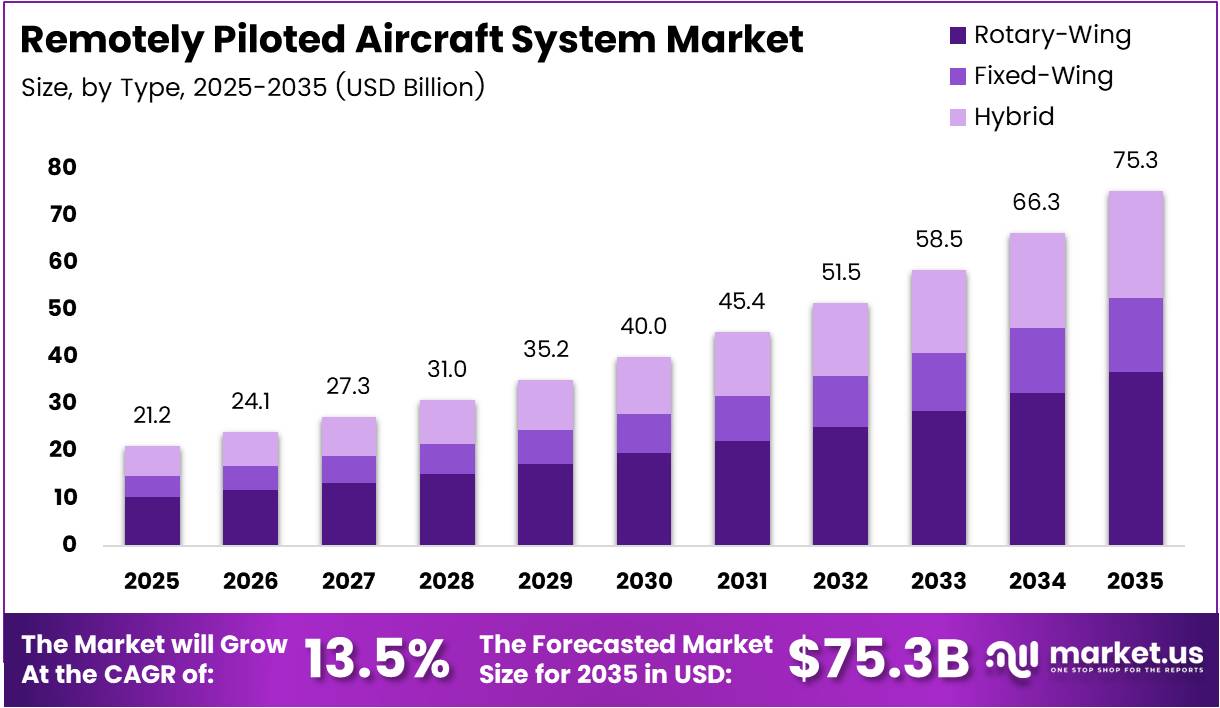 Global Remotely Piloted Aircraft System Market size is expected to be worth around USD 75.3 Billion by 2035 from USD 21.2 Billion in 2025, growing at a CAGR of 13.5% during the forecast period 2026 to 2035.