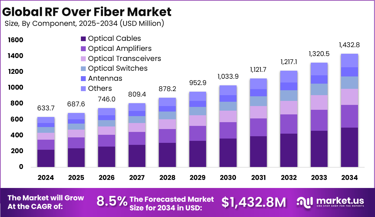 Global RF Over Fiber Market Size, Share Analaysis Report By Component (Optical Cables, Optical Amplifiers, Optical Transceivers, Optical Switches, Antennas, Others), By Frequency Band (L (Up to 2 Ghz), S (2-4 Ghz), C (4-8 Ghz), X (8-12 Ghz), KU (12-18 Ghz), KA (26.2-40 Ghz), By Application (Communication, Broadband, Radar, Navigation), By Vertical (It & Telecom, Government & Defense, Marine, Commercial Aviation, Others), By Region and Companies - Industry Segment Outlook, Market Assessment, Competition Scenario, Trends and Forecast 2025-2034